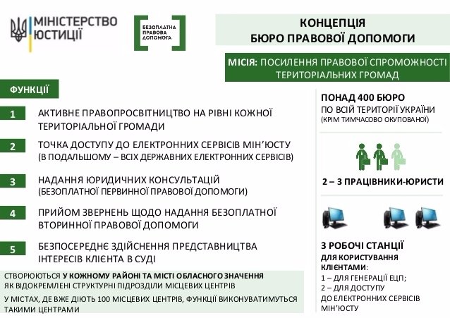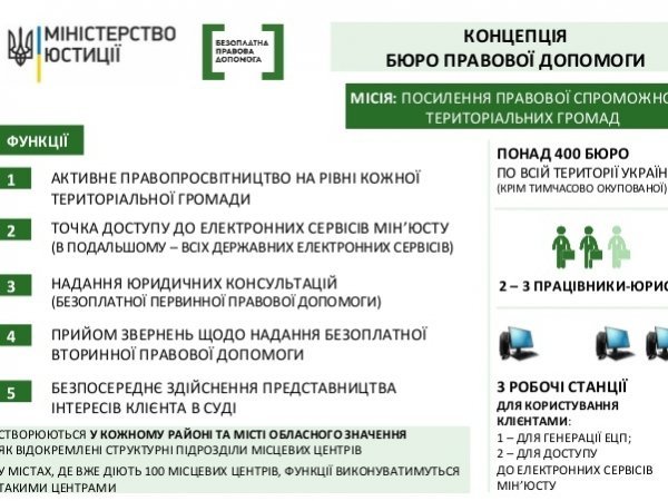 Міністерством юстиції України затверджено Типове положення про бюро правової допомоги, відповідно до якого по всій території України запрацюють бюро правової допомоги.