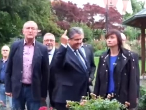 Німецькі ЗМІ опублікували відеоролик, на якому віце-канцлер ФРН Зігмар Габріель показує середній палець протестувальникам з радикальної націонал-демократичної партії Німеччини.