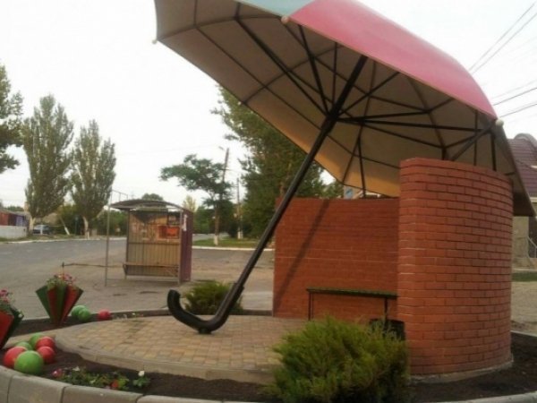 Крім того, зупинку з парасолькою прикрасили незвичайними клумбами у вигляді різнокольорових парасольок. А зупинку у китайському стилі прикрашають триколірні краплі на землі.