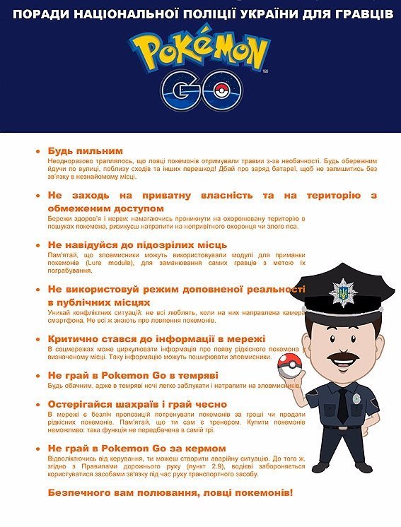 Використовуючи зарубіжний досвід реагування державних органів на інциденти, пов’язані з «Pokemon GO», з метою здійснення превентивної діяльності з недопущення тяжких наслідків для прихильників гри та захисту законних прав та інтересів осіб, які мимоволі можуть бути втягнуті до неї, на першому етапі готові запропонувати пам’ятку для кожного.