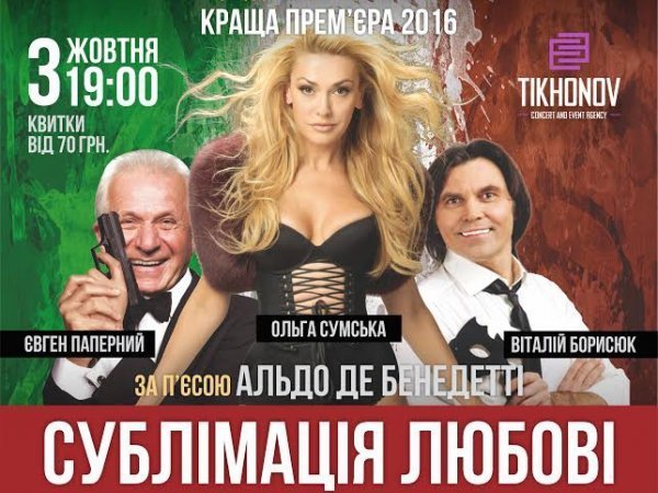 Приходьте 3 жовтня о 19.00 у Драмтеатр на виставу «Сублімація любові», аби у компанії улюблених українських акторів насолодитися іскрометним гумором, філігранно вивіреними мізансценами, класичною римською сценографією і справжніми італійськими пристрастями!