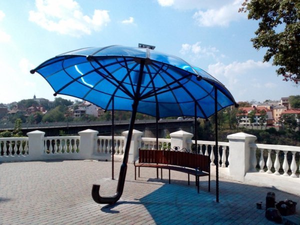 У Кам'янці-Подільському на Хмельниччині на міській "Алеї закоханих" встановили гігантську металеву парасольку, на куполі якої розміщені 4 сонячні батареї для підзарядки мобільних телефонів та ґаджетів.