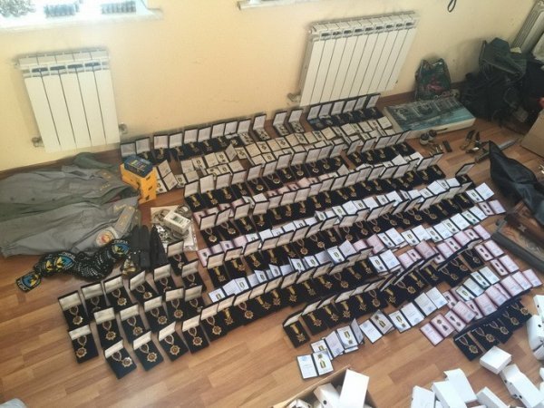 Під час обшуків за місцем проживання зловмисників оперативники спецслужби вилучили велику кількість зброї, спецзасоби, форму працівників правоохоронних органів, генеральські погони, безліч нагород, підроблені номерні знаки, підроблене посвідчення високопосадовця та ін.