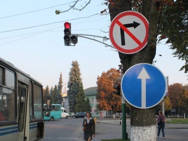 У центрі Володимира-Волинського навпроти автостанції на дереві розмістилися два дорожні знаки.