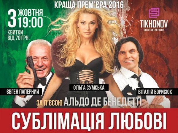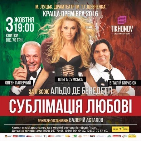 Приходьте 3 жовтня о 19.00 у Драмтеатр на виставу «Сублімація любові», аби у компанії улюблених українських акторів насолодитися іскрометним гумором, філігранно вивіреними мізансценами, класичною римською сценографією і справжніми італійськими пристрастями!