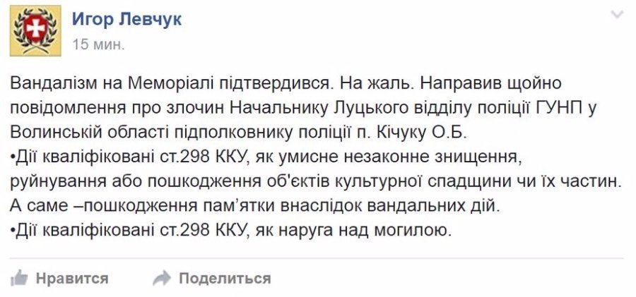 "Дії кваліфіковані ст.298 ККУ як умисне незаконне знищення, руйнування або пошкодження об'єктів культурної спадщини чи їх частин. А саме – пошкодження пам’ятки внаслідок вандальних дій", - йдеться в дописі.