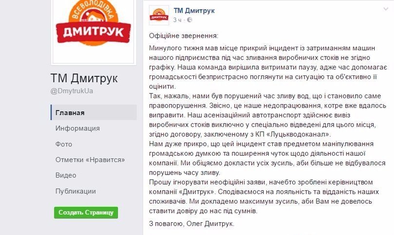 Прошу ігнорувати неофіційні заяви, начебто зроблені керівництвом компанії «Дмитрук». Сподіваємося на лояльність та відданість наших споживачів. Ми докладемо максимум зусиль, аби Вам не довелось ставити довіру до нас під сумнів", - йдеться у дописі.