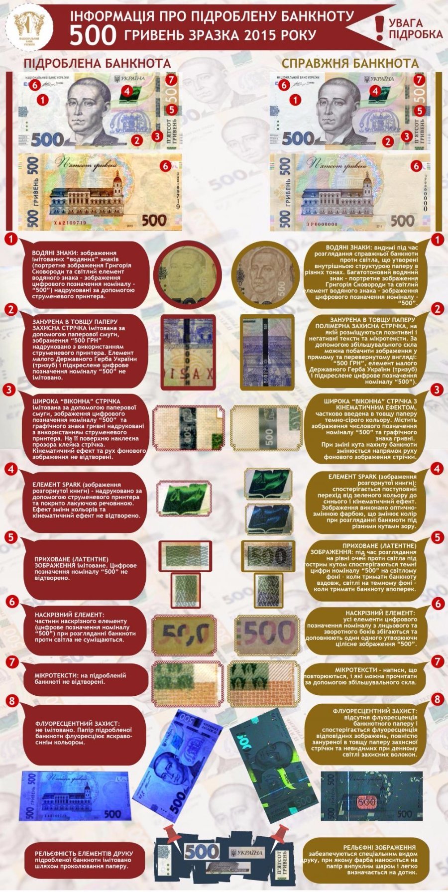 Національний банк України констатує, що в країні з'явилися підроблені 500-гривневі банкноти зразка 2015-го, які ввели в обіг лише півроку тому.
