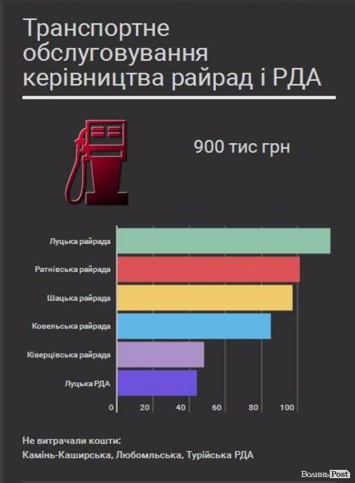 Найдорожчим виявився проїзд голови та заступників Луцької (понад 118,2 тис. грн), Ратнівської (майже 101,6 тис. грн) та Шацької (понад 96,5 тис. грн). Для прикладу, у Шацькій РДА аналогічні видатки становили понад 17 тисяч гривень.