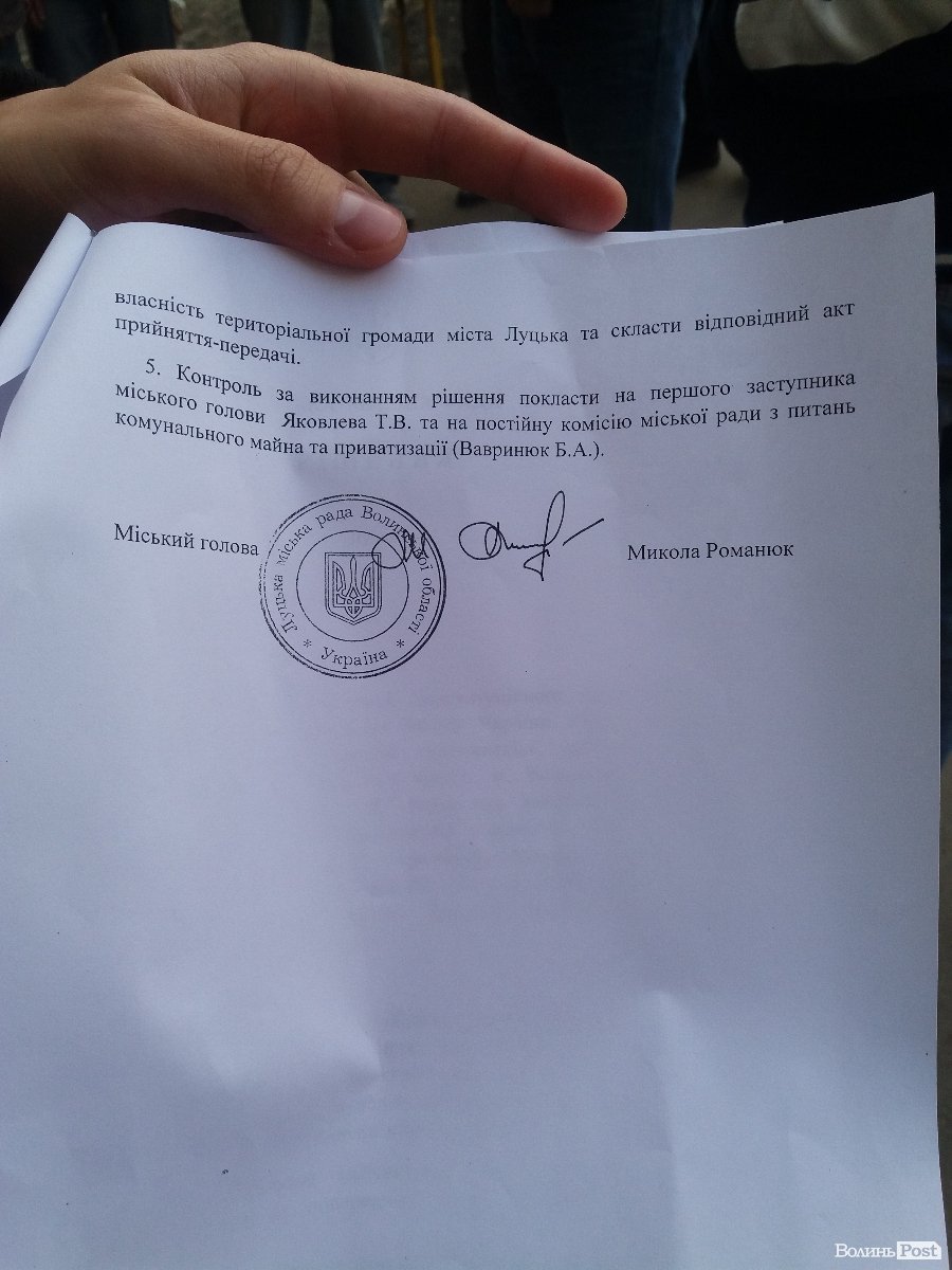 Зокрема, Євген Ткачук показав мешканцям гуртожитку рішення Луцькради від 28 вересня, відповідно до якого у комунальну власність було прийнято 6 гуртожитків, які раніше належали Міністерству оборони, і разом з тим передбачено в бюджеті міста 2,5 мільйона гривень для придбання та взяття на баланс гуртожитку ПАТ «Електротермометрія».