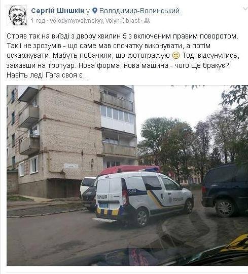 «Стояв так на виїзді з двору хвилин 5 з включеним правим поворотом. Так і не зрозумів - що саме мав спочатку виконувати, а потім оскаржувати. Мабуть, побачили, що фотографую. Тоді нарешті відсунулись, заїхавши на тротуар. Нова форма, нова машина - чого ще бракує?» - зазначає Шишкін у коментарі до оприлюдненої світлини.