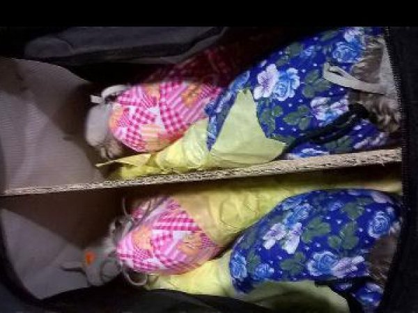 Крила птахів були загорнуті у різнокольорову тканину та скріплені жовтою паперовою клейкою стрічкою в області лап.