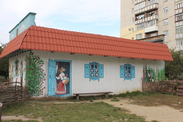 Казкова трансформаторна підстанція яскраво завершує дворове оновлення. Поки на одній стіні Дід і Баба стережуть Колобка, на другій Коза відчиняє двері хати, де її чекають козенята, а підступний Вовк злиться, що не встиг їх обдурити.