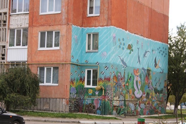 Роботи із облаштування двору розпочали торік улітку. Тоді художник Володимир Ісаков намалював величезний малюнок на морську тему. На стіні будинку на вулиці Федорова, 1 тепер плаває русалка, дельфін, риби, а на дні моря лежить затонулий корабель. Подбали й про дитячий майданчик: усе пофарбовано у приємні кольори. Старі автомобільні шини слугують як квітники.