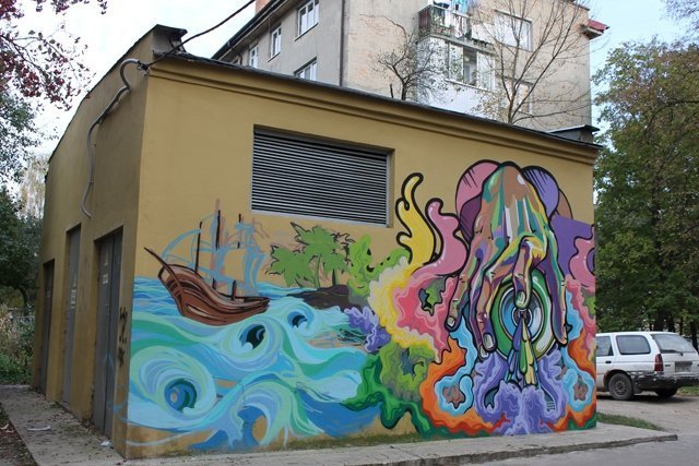 На проспекті Перемоги графітник створив такий собі автопортрет. На стіні персикового кольору зображено хлопця, що розпилює фарбу із балончика. Згодом автори додали романтики на підстанції: намалювали штормове море, на якому бореться із хвилями корабель, і вдалині видніється острів із пальмами.