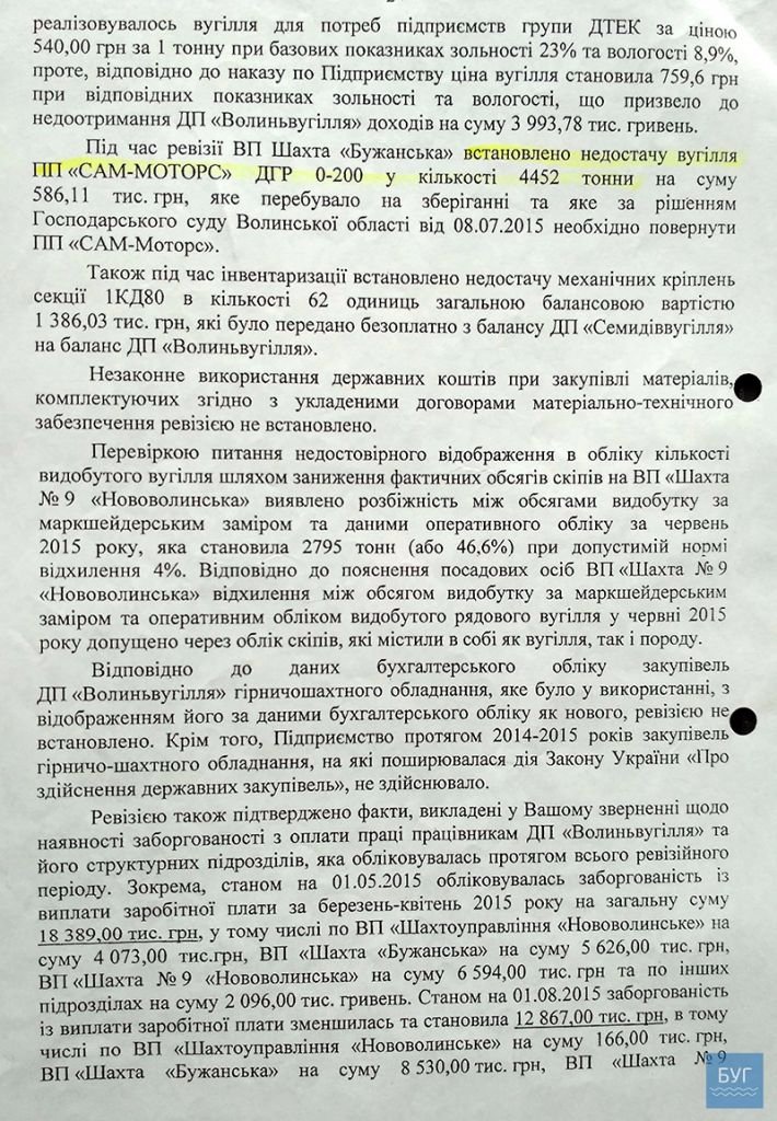 Під час ревізії ВП шахта “Бужанська” встановлено недостачу вугілля у кількості 4452 тонни на суму 586 000 гривень. Також під час інвентаризації було встановлено недостачу механічних кріплень в кількості 62 одиниць загальною балансовою вартістю 1 386 030 гривень.