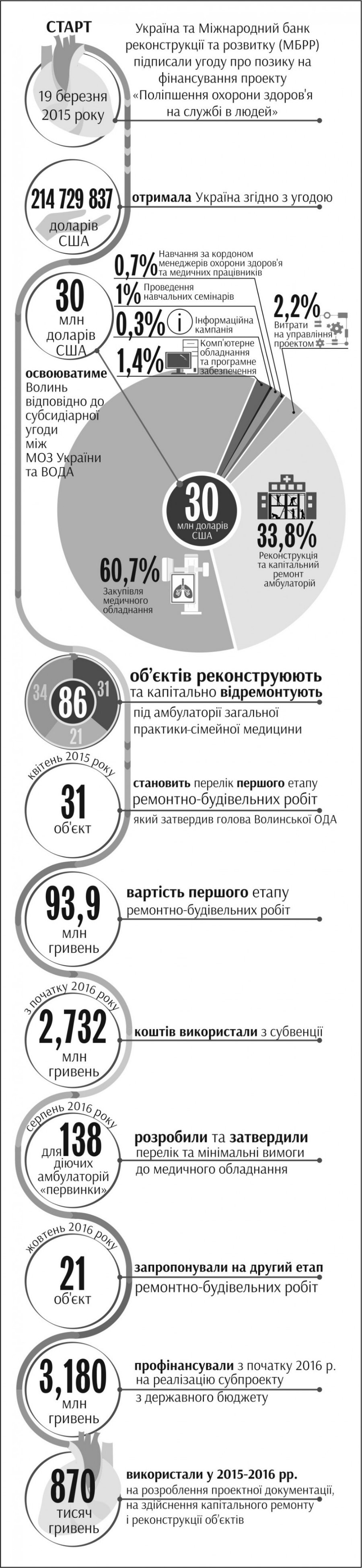 У рамках проекту області виділили 30 мільйонів доларів. Вони підуть на реконструкцію та капітальний ремонт 138 діючих та 86 нових амбулаторій загальної практики сімейної медицини, - повідомляє Район Луцьк з посиланням на тижневик «Сім’я і Дім».