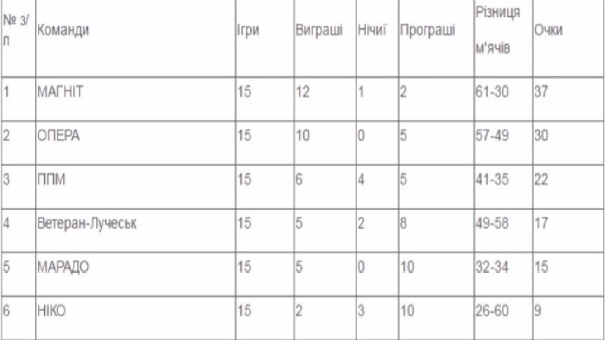 Підсумкова таблиця чемпіонату м.Луцька з футболу 2016 року серед аматорських команд