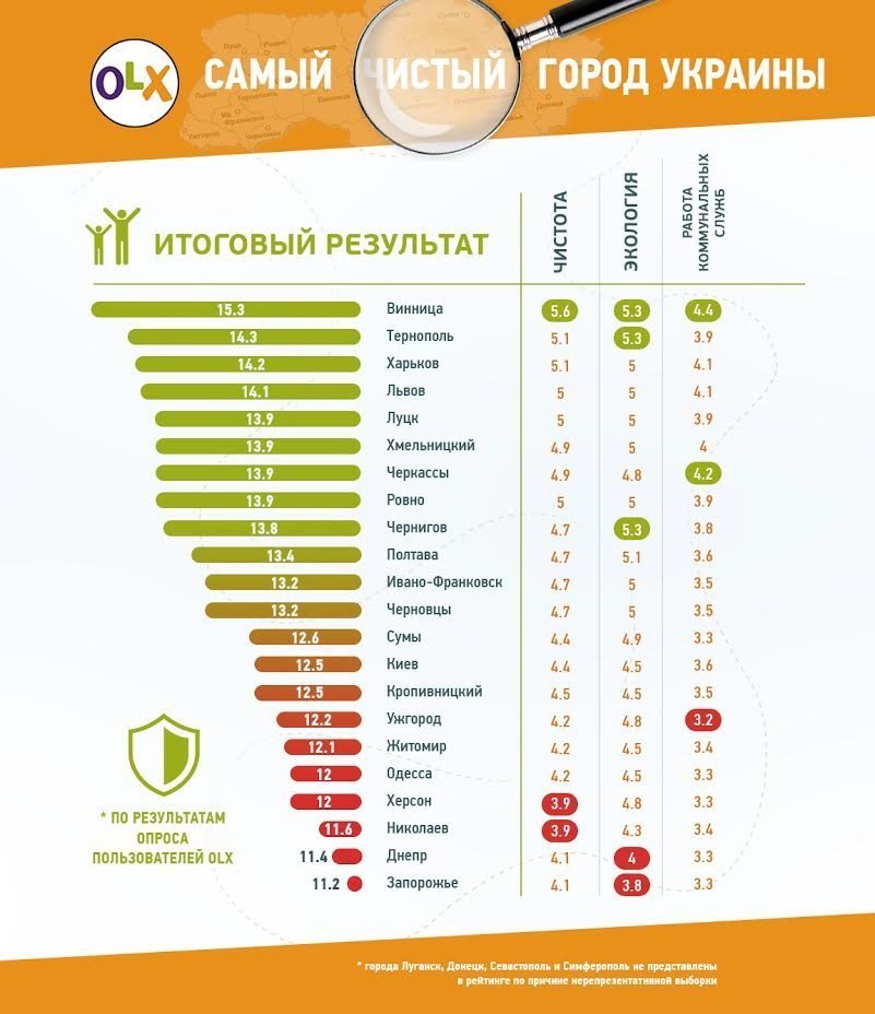 У рамках проекту «Ідеальне місто» понад 33 тисячі українських користувачів OLX оцінило рівень життя в обласних центрах країни. Учасники опитування виставляли бали від одного до семи за десятьма критеріїв, зокрема розвиненістю інфраструктури, безпекою та привітністю городян. «Отриманий рейтинг став справді народним, тоді як більшість аналогічних досліджень ґрунтується на думці експертів», - йдеться у повідомленні.