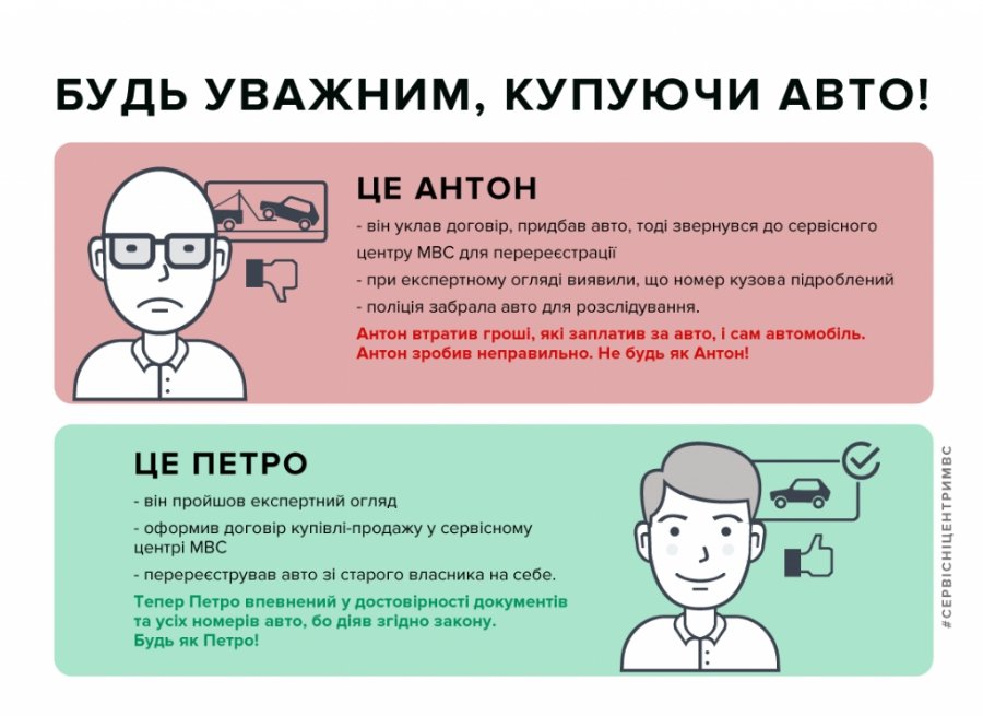 "Пам`ятайте, що оформлення договору купівлі-продажу та перереєстрації авто у сервісних центрах МВС є гарантією надійної купівлі авто, адже у разі виявлення змін у номерах кузова чи двигуна автомобіль відправляють на штрафмайданчик і передають справу до поліції, а новоспечений власник авто залишається і без авто, і без грошей", - кажуть в сервісному центрі.