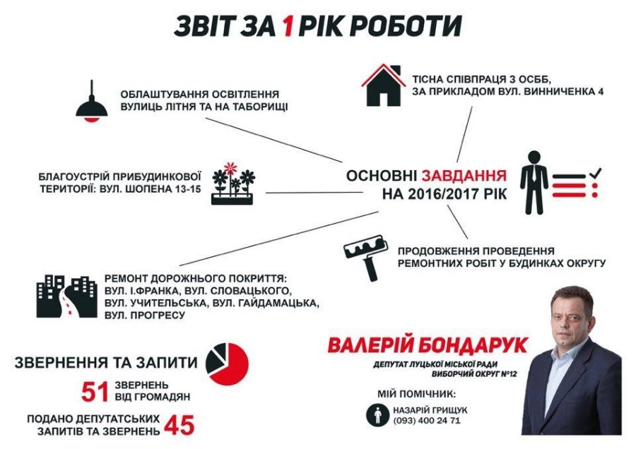 Бондарук подав 45 запитів і звернень, а в 2016/2017 роках займатиметься вирішенням таких проблем: освітлення вулиць Літня і На Таборищі; благоустрій прибудинкової території за адресами вулиця Шопена, 13-15; ремонт вулиць Івана Франка, Словацького, Учительська, Гайдамацька і Прогресу.