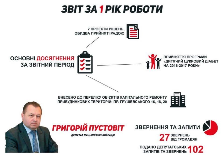 Депутат Григорій Пустовіт звітує про 102 запити і звернення, 27 звернень громадян. Окрім того в доробку обранця - внесено до переліку об'єктів капітального ремонту прибудинкових територій проспект Грушевського 16, 18, 20.