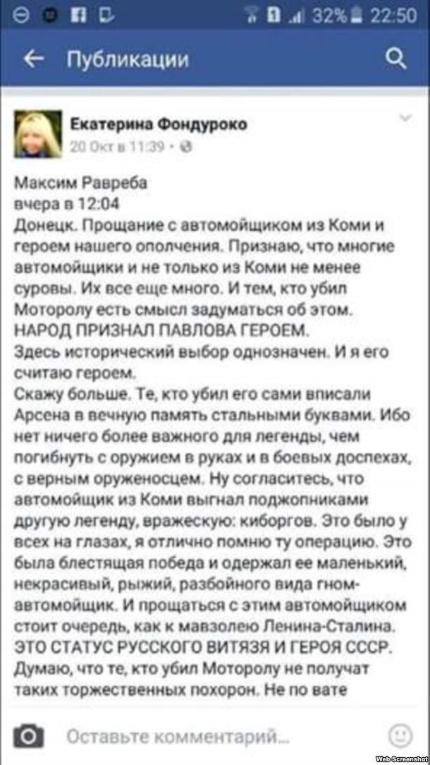 Актриса Катерина Фондуроко на своїй сторінці у Facebook стала на захист нападниці, кепкувала з побитого бійця, називала бойовика «Моторолу» «героєм».