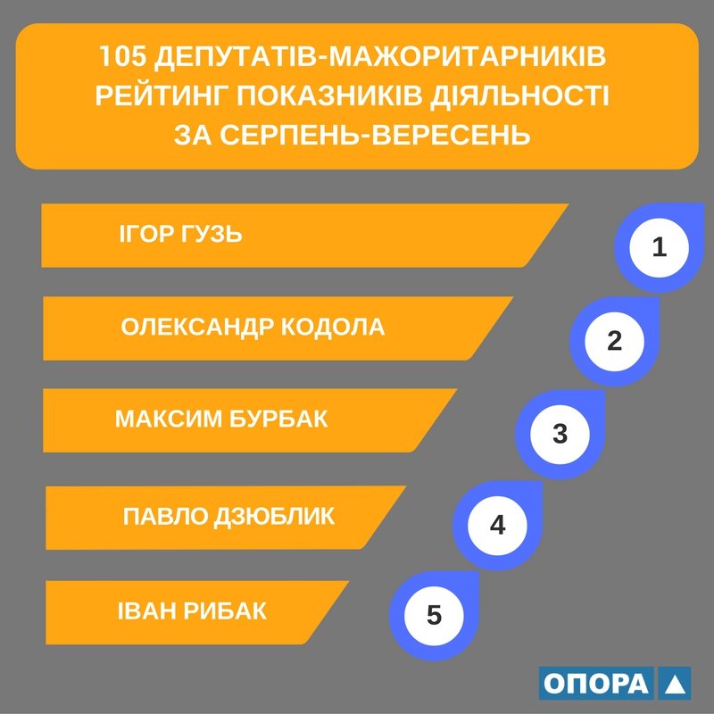 Вересневий рейтинг активності 105 депутатів-мажоритарників Громадянської мережі «Опора» містить і серпневі показники народних обранців щодо законодавчої діяльності та роботи у округах.