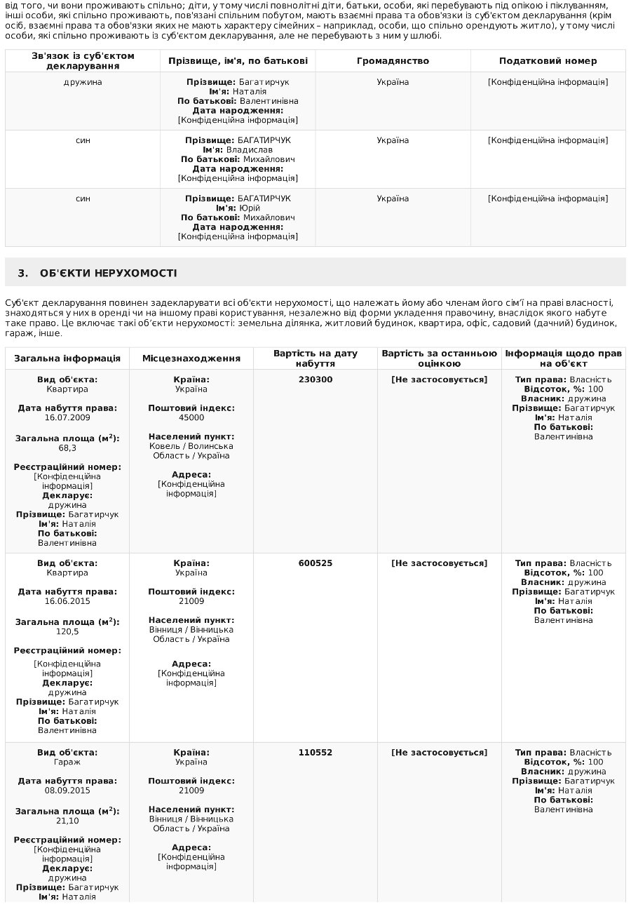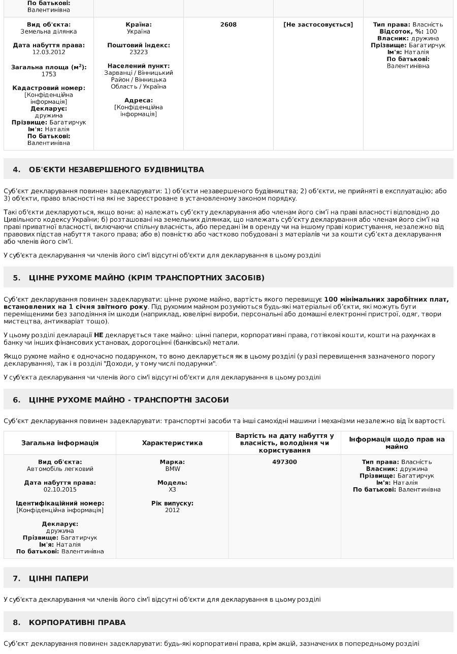 На дружині - єдине авто сім'ї. Йдеться про "БМВ" моделі "Ікс3" 2012 року випуску, яке обійшлося в 497 300 гривень.