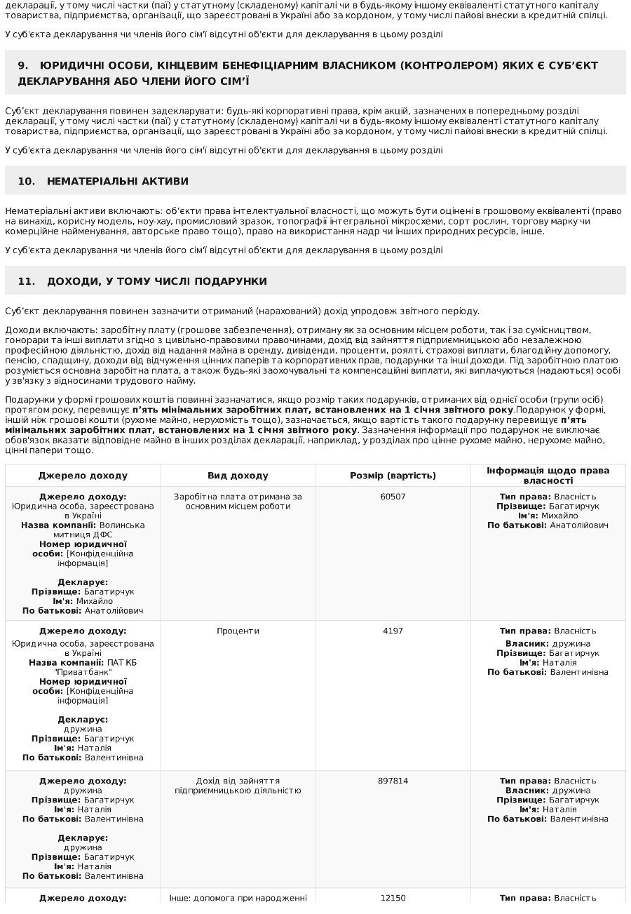 Наталія Багатирчук - 897 814 гривень доходу від зайняття підприємницькою діяльністю, 4 197 грн процентів та 12 150 допомоги при народженні дитини.