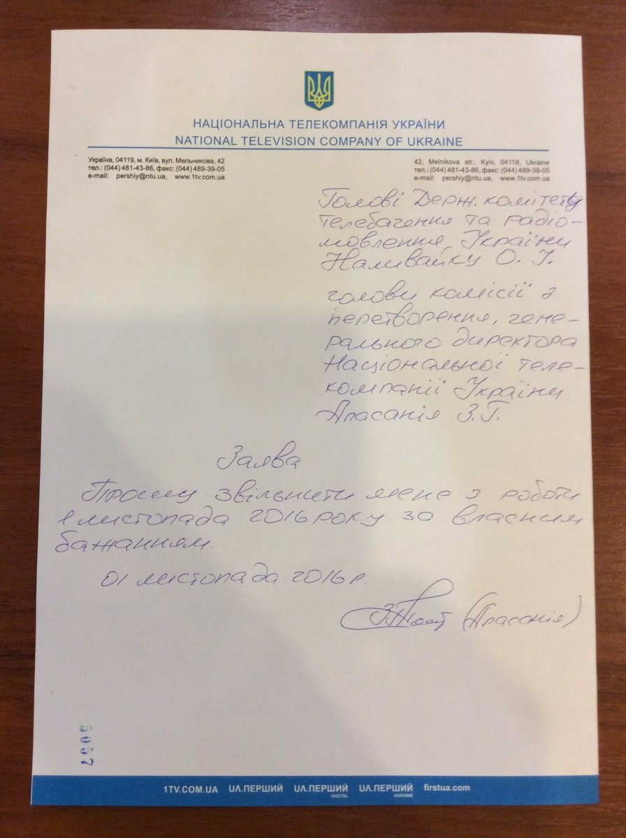 Стало відомо про заяву на звільнення за власним бажанням генерального директора Національної телекомпанії України.