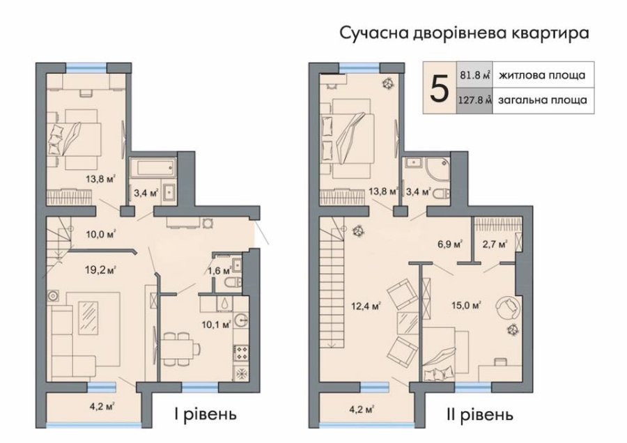 4) Дворівнева квартира площею 128 метрів квадратних у місті Ковель. Будинок зведений вже на 99%, апартаменти розміщені на 4-му та 5-му поверхах.