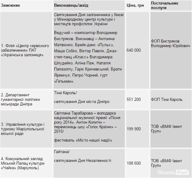 Філія «Центр сервісного забезпечення» ПАТ «Українська залізниця» на таку суму замовила у нього організацію святкування Дня залізничника 3 листопада у Києві.