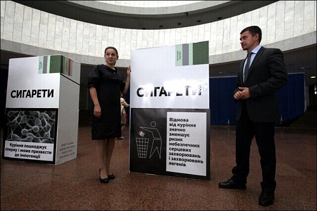 50% передньої частини пачки буде займати напис: "Куріння вбиває", а із зворотного боку на 50% розміститься графічне зображення з попереджувальним написом.