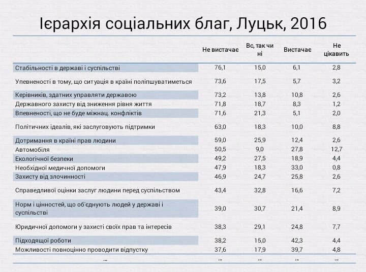 Серед різних соціальних благ лучанам у червні 2016-го року найбільше не вистачало стабільності у державі та суспільстві.