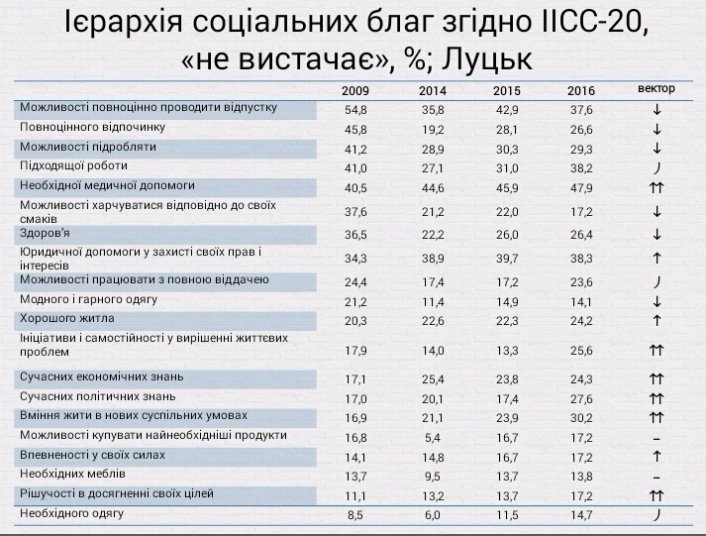 Вже з 2014 року лучани переорієнтовуються з благ першої необхідності "харчування, працевлаштування, здоров’я" на блага нематеріальної природи. Зокрема, вони (від половини до ¾ лучан) потребують справедливої оцінки заслуг людини перед суспільством, упевненості в поліпшенні ситуації в країні, вартих підтримки політичних ідеалів, дотримання прав людини, державного захисту від зниження рівня життя, здатних управляти державою керівників, впевненості, що не буде міжнаціональних конфліктів, та стабільності в державі й суспільстві.