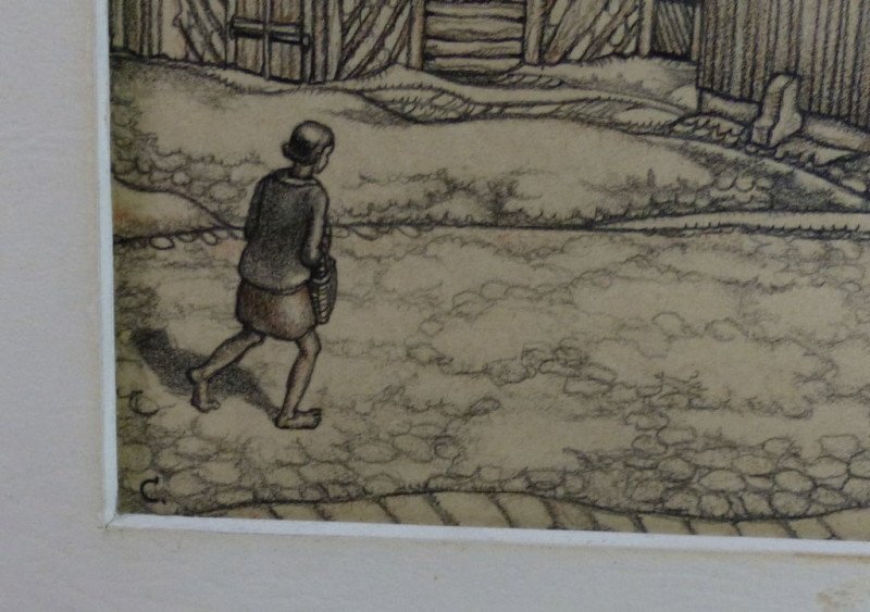 Зображення має розмір 33х24 см, з рамкою – 55х55 см. У підписі на звороті йдеться, що це двоколірний крейдяний малюнок.