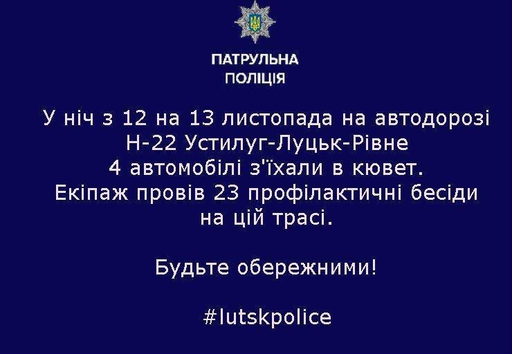 За ніч з 12 на 13 листопада на одній з трас Волині 4 автомобілі злетіли в кювет.