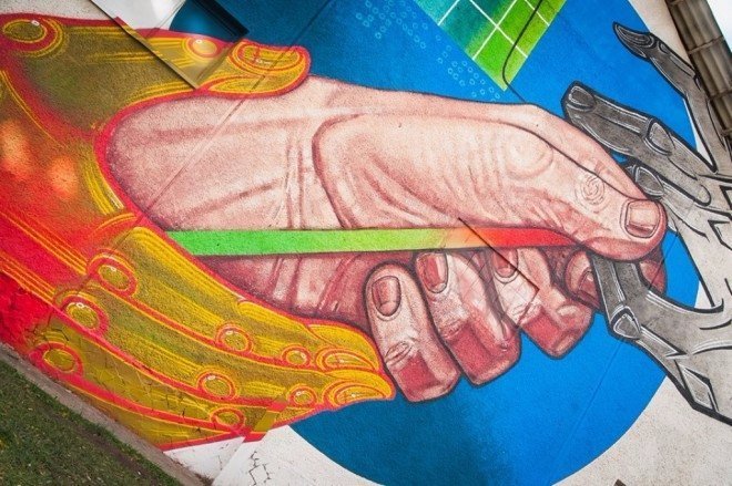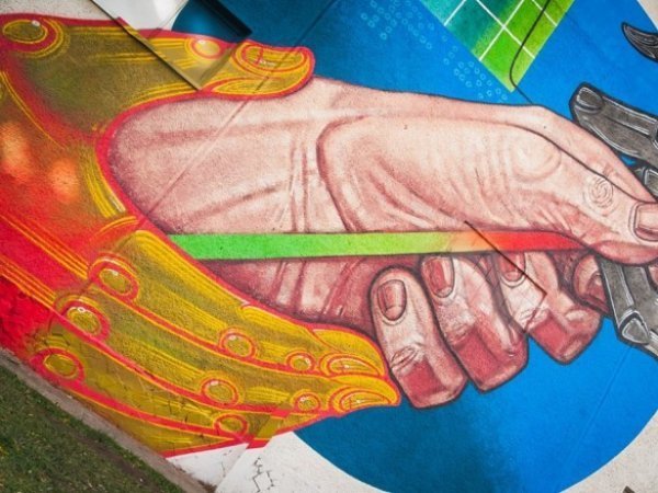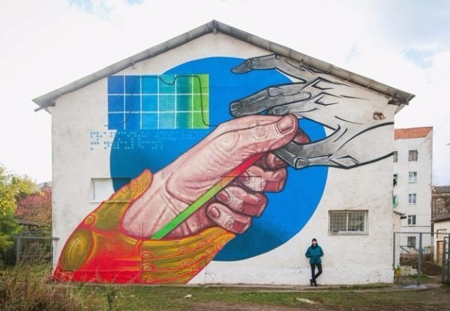 «Об’єктом розпису виступають руки, написані в трьох різних візуальних пластиках (графіча, іконописна, реалістична). Головна ідея – дослідження і вивчення поведінки людей («примусовий глядач») у публічному просторі. Також різні візуальні підходи - це спроба «жонглювання» пластикою, заради «візуальної маніпуляції» споживчих рефлексій даної локації. У муралі присутній лінійний інформаційний графік, поділений на 6 днів і трьохбальну шкалу оцінки, що відображає персональні комунікації з місцевим населенням», - поділився художник.