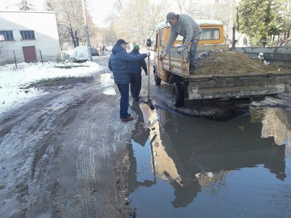 Луцький депутат з шуфлею в руках засипав калюжі на окрузі