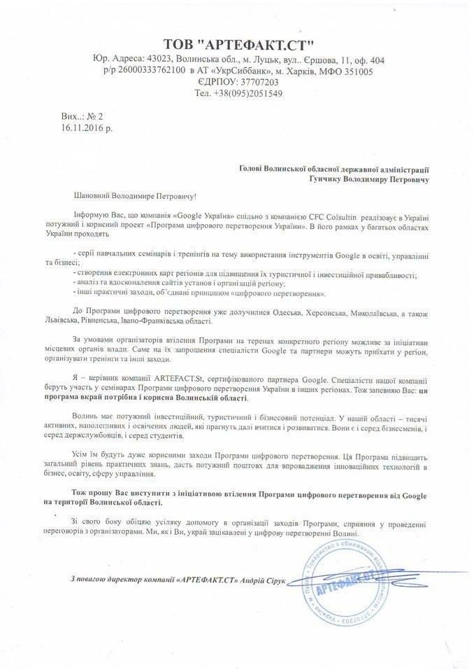 «Написав листа губернатору. Бо маю «ідею-фікс»: хочу, щоб і Волинська область взяла участь в Програмі цифрового перетворення від Google», ‒ коментує Сірук документ.