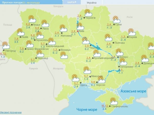 Температура вночі 0…+5°С, удень +8…+13°С. На дорогах місцями ожеледиця. Укргідрометцентр Прогноз погоди в Україні на 21 листопада 2016 року