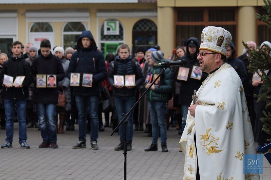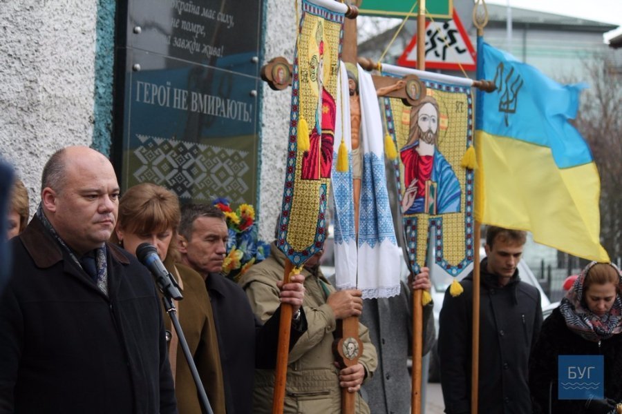 Після покладання квітів до стели Пам’яті полеглим учасникам АТО усі присутні на заході вирушили до меморіальної дошки Героям Небесної Сотні, де священики відслужили молебень, а представники влади поклали квіти та вшанували загиблих на Майдані хвилиною мовчання.