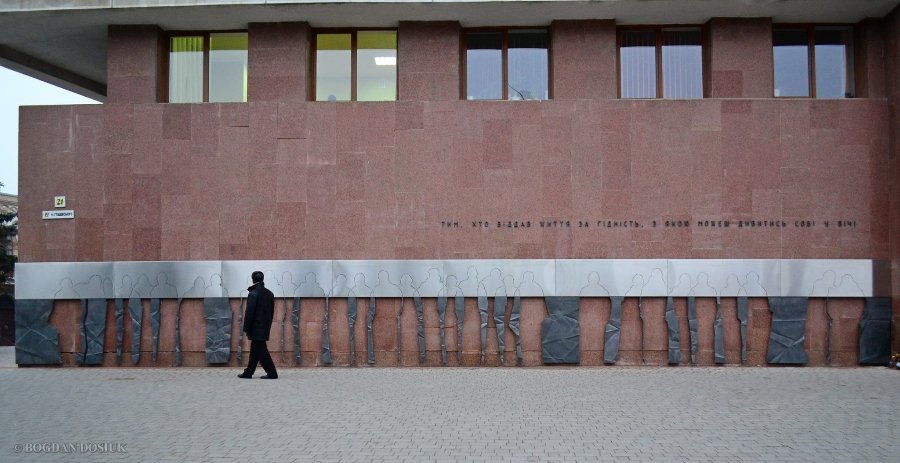 В Івано-Франківську на стіні адмінбудівлі, що на вулиці Грушевського 21, з нагоди 3-ої річниці Майдану, Дня Гідності та Свободи встановили пам'ятний монумент Героям Небесної Сотні.