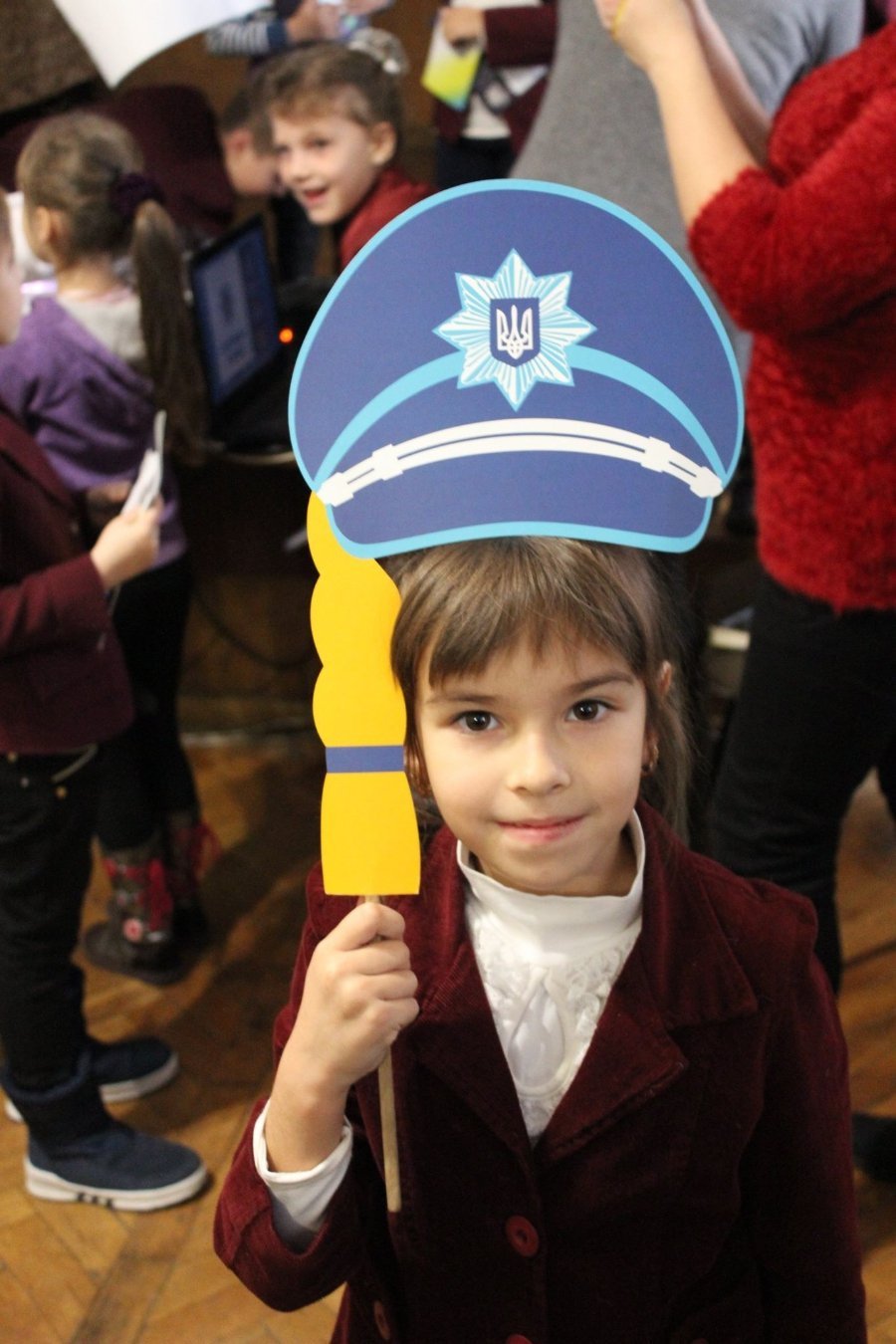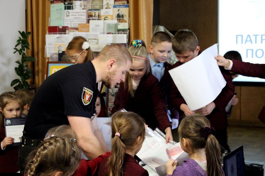 Школярі отримали тематичні книжечки у подарунок та світловідбивні наклейки від патрульної поліції, а поліцейському подарували малюнки.