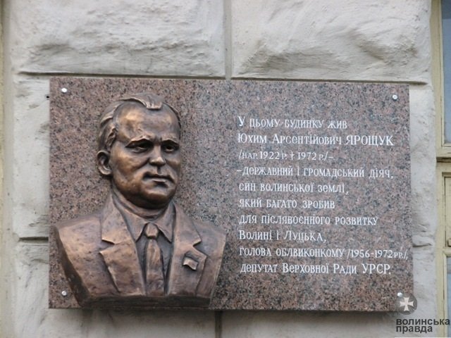 У тексті на меморіальній дошці йдеться: «У цьому будинку жив Юхим Арсентійович Ярощук (1922 – 1972) – державний і громадський діяч, син волинської землі, який багато зробив для післявоєнного розвитку Волині і Луцька, голова облвиконкому (1956-1972 рр.), депутат Верховної Ради УРСР.