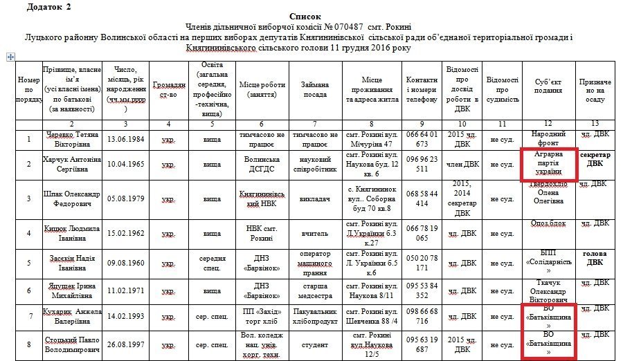 Луцька районна виборча комісія Волинської області сформувала 6 дільничних виборчих комісій у Княгининівській об’єднаній територіальній громаді, до складу яких включила 6 кандидатур, поданих місцевою організацією Аграрної партії України, а також 3 особи за поданням місцевої організації політичної партії ВО «Батьківщина».