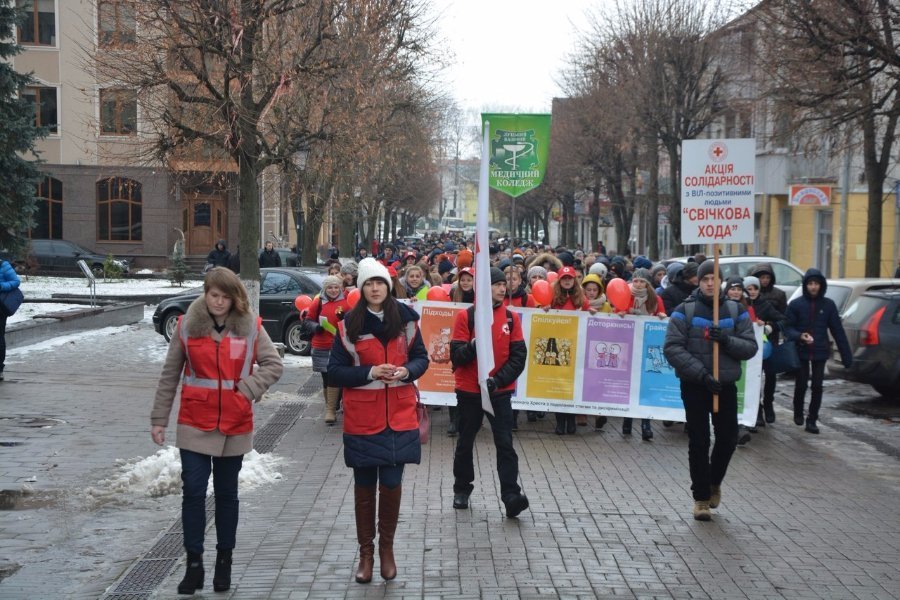 Учасники акції, біля стін Луцького базового медичного коледжу, а це молодь міста з плакатами-гаслами, інформативними прапорцями, повітряними кульками та літературою з профілактичною тематикою на тему ВІЛ/СНІДу здійснили «Свічкову ходу» від медичного коледжу вулицею Лесі Українки до Театрального майдану міста Луцька, щоб викласти стрічку з запалених лампадок.