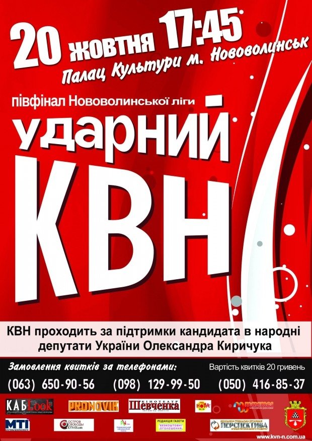 По місту Нововолинську розклеїли плакати із рекламою півфіналу Нововолинської ліги КВН, що відбудеться у міському Палаці культури. На них також вказано, що цей захід підтримує кандидат у народні депутати від партії «УДАР» Олександр Киричук.