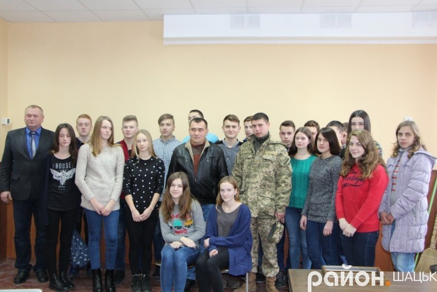 До одинадцятикласників шацької гімназії завітали голова громадської організації «Ветерани АТО Шацького району» Ярослав Крат та працівник Шацького районного військового комісаріату Валентин Борух.